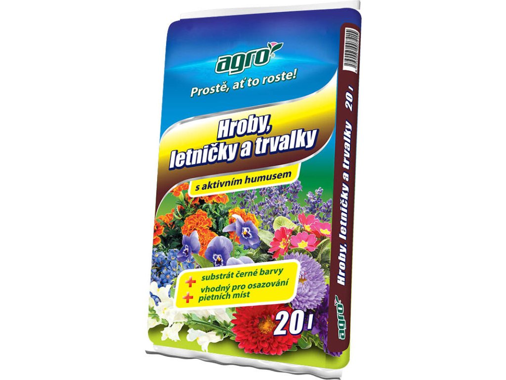 AGRO Substrát na hroby je určený k výsadbě letniček, dvouletek i trvalek (viola, salvia, begonia, tagetes,...). Díky přirozené decentní černé barvě je vhodný na osazování pietních míst, kde dotváří smuteční vzhled a pietní náladu. Substrát pro hroby je směsný produkt obsahující vybrané druhy rašelin, kvalitní humus s upravenou pH reakcí, nechybí přiměřený obsah živin a vhodné stopové prvky.