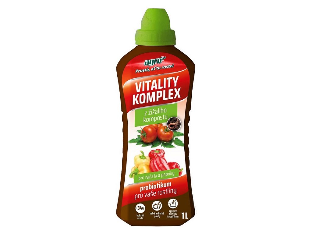 AGRO Vitality Komplex Rajče a paprika je jedinečný přípravek ideální pro všechny druhy rajčat a paprik. Nejedná se o běžné hnojivo. Vedle hlavních živin a mikroprvků obsahuje tzv. urychlovač růstu. Jde o speciální výluh z vermikompostu, který vzniká činností kalifornských žížal. Obsahuje přírodní enzymy a humusové látky, které rostlinu probudí k životu a dodají jí potřebnou energii k růstu a kvetení.