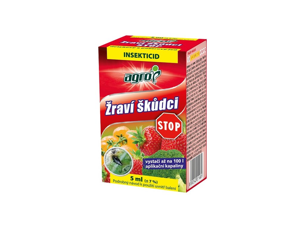 AGRO Žraví škůdci STOP je kontaktní insekticid – působí jako dotykový a požerový jed. Účinkuje proti květopasům, housenkám, třásněnkám apod. na zelenině, ovoci i okrasných rostlinách.