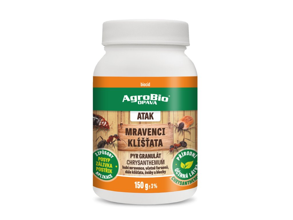 Biocid s přírodní účinnou látkou Chrysanthemum. Mikrogranulát pro hubení mravenců (včetně mravence farao), klíšťat, blech, švábů. 3 způsoby aplikace - posypem, postřikem nebo zálivkou. Obsahuje hořké ochucovadlo (proti nechtěnému požeru domácími zvířaty). Hubí hmyz a jejich hnízda (např. mraveniště) přírodní účinnou látkou. Je vhodný do interiéru i exteriéru. Používejte biocidy bezpečným způsobem. Před použitím si vždy přečtěte označení a informace o přípravku.