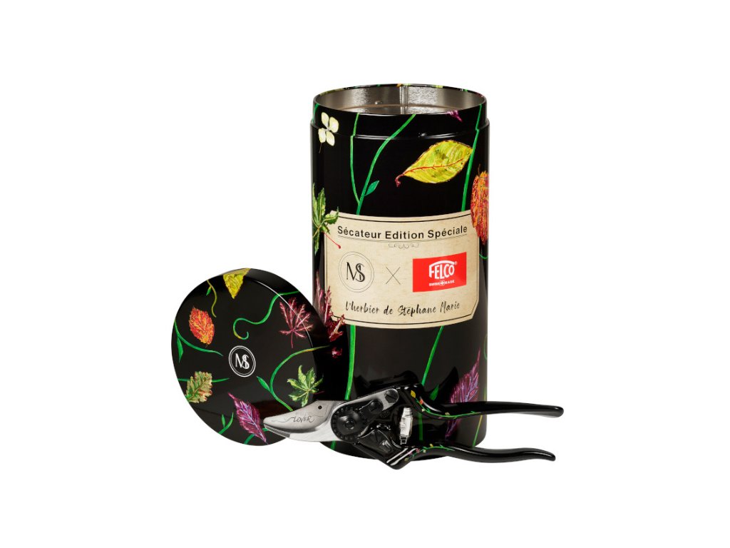 Nůžky FELCO 6 tentokrát ve speciální edici Stéphane Marie. Rukojeti z kovovaného hliníku jsou při výrobě nejprve černě eloxovány, technikou UV tisku je na černé rukojeti následně nanesen motiv herbáře Stéphana Marie, finální ochrannou vrstvu rukojetí tvoří práškové lakování.