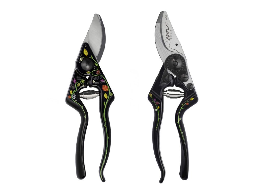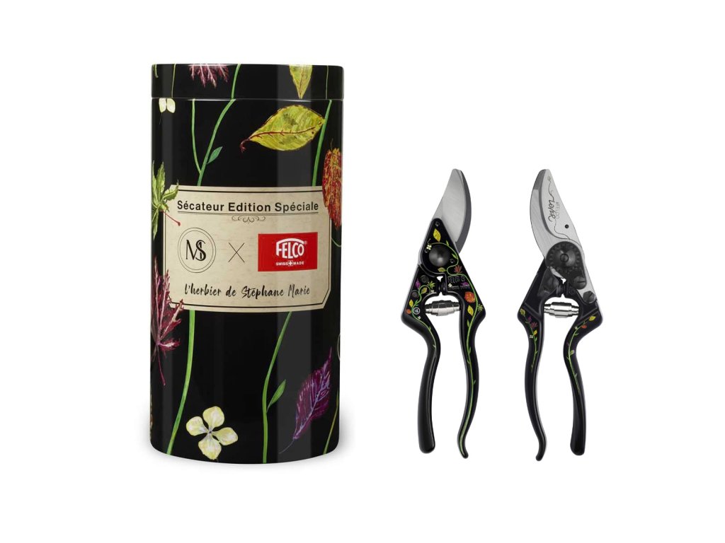 Proslulé nůžky FELCO 8 tentokrát ve speciální edici Stéphane Marie. Rukojeti z kovovaného hliníku jsou při výrobě nejprve černě eloxovány, technikou UV tisku je na černé rukojeti následně nanesen motiv herbáře Stéphana Marie, finální ochrannou vrstvu rukojetí tvoří práškové lakování.
