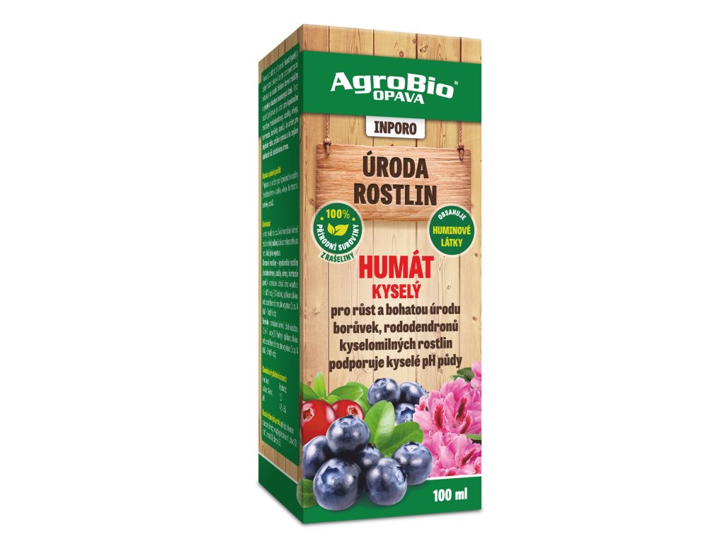 PŘÍRODNÍ PRODUKT. Humát kyselý je vodný roztok získaný řízeným procesem vodné extrakce ze suché tříděné černé rašeliny s vysokým obsahem huminových látek. Tento kapalný přípravek je určen pro kyselomilné rostliny (rododendrony, azalky, vřesy, hortenzie, borůvky, apod.). Je určen pro zlepšení růstu, zvýšení výnosu a odstranění stresových zátěží rostlin. Má antibakteriální účinky. Díky kyselému pH je možné použít Humát kyselý jako přírodní okyselovač.
