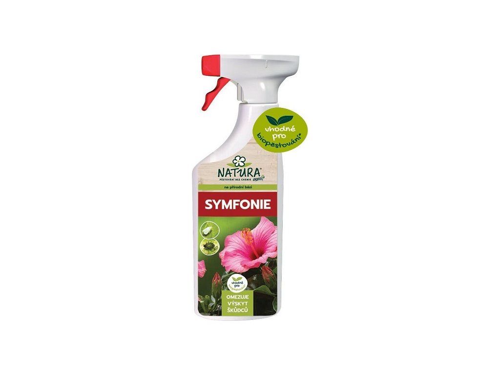 Agro NATURA Symfonie je unikátní hotový postřik na bázi přírodních látek proti škůdcům,se zlepšujícím dekorativním efektem rostlin. Je určen na ochranu okrasných rostlin doma, na balkóně či venku. Svým kontaktním účinkem s protipožerovým efektem spolehlivě účinkuje na mšice, molice, svilušky, třásněnky, červce – puklice (v raném stadiu). Neškodí užitečným organismům; nehrozí vytvoření rezistence a nemá nebezpečné vlastnosti (žádné výstražné symboly).unikátní hotový postřik na bázi přírodních látek proti škůdcům