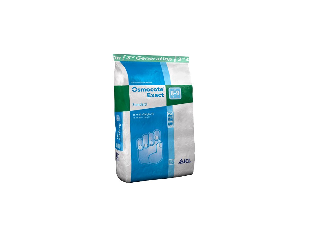 Osmocote Exact Standard 8-9M uvolňuje živiny rovnoměrně v průběhu celé sezóny. Je to nejlepší produkt pro použití téměř v jakýchkoliv podmínkách. Spolehlivost a popularita jej řadí mezi nejčastěji používané produkty u pěstitelů okrasných rostlin. Stále stejný vzorec uvolňování živin je ideální pro rychle rostoucí konifery a stálezelené rostliny. Velikost granulí je 2 - 4,5 mm.