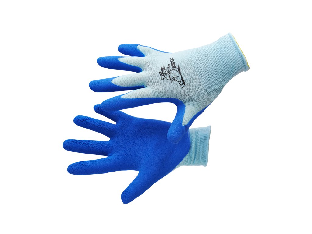 Pracovní dětské rukavice. Barvy modré, 2 velikosti (4,5). Bateriál nylon/latex. Rozměry rukavice velikosti 4 - délka prstu 4-6 cm (dle prstů), vnitřní délka palce je 4,5 cm, šířka rukavice 7,2 cm, délka celé rukavice 20,5 cm. Rozměry rukavice velikosti 5 - délka prstu 4-7 cm (dle prstů), vnitřní délka palce je 5 cm, šířka rukavce 7,5 cm, délka celé rukavice 21 cm.