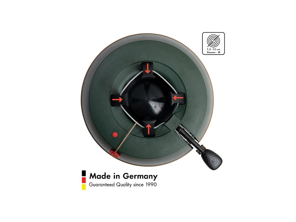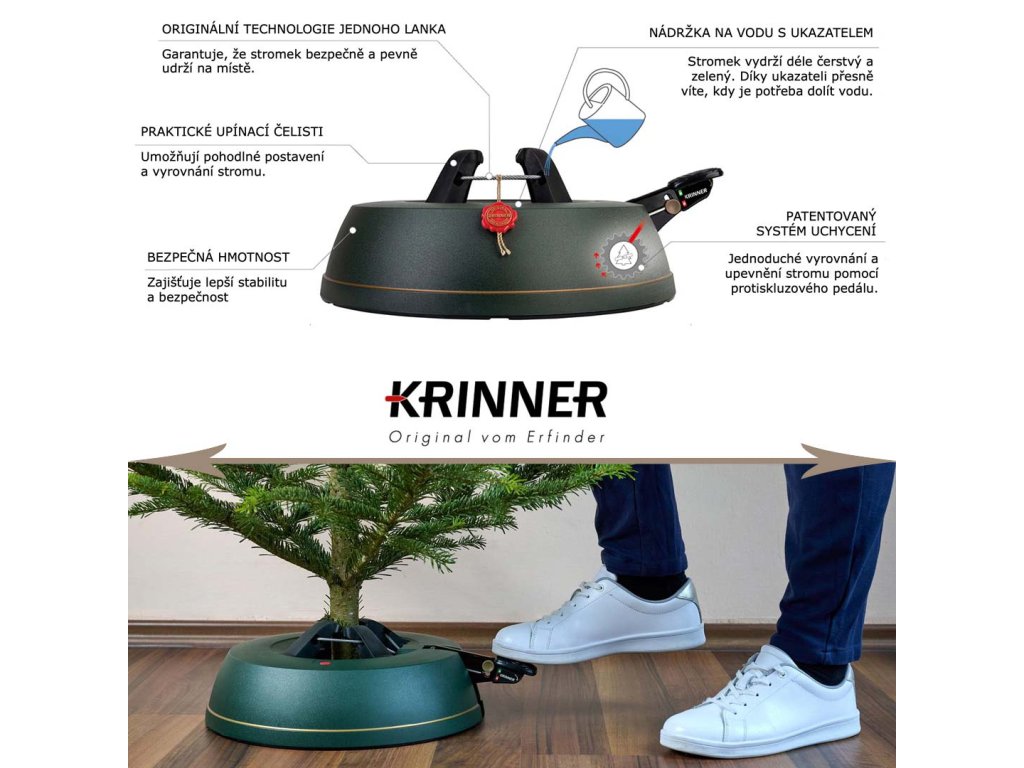 Současná řada Comfort Grip byla vylepšena o nový bezpečnostní pedál. Výrazně větší nášlapná plocha zajišťuje při sešlápnutí pedálu nejlepší možnou přilnavost chodidla nebo boty. Všechny stojany na vánoční stromky KRINNER jsou vybaveny osvědčenou originální technologií s jedním lanem pro všechny druhy stromků a zaručují rovnoměrný tlak držáků na kmen stromu. Jednoduše umístěte stromek do stojanu, stiskněte nášlapný pedál a hotovo! Ať už je stromek silný, tenký nebo křivě rostlý, stojí bezpečně a vzpřímeně. Patentovaný bezpečnostní pás s mechanismem postupného otevírání navíc poskytuje dodatečnou bezpečnost a zabraňuje nechtěnému převrácení.
